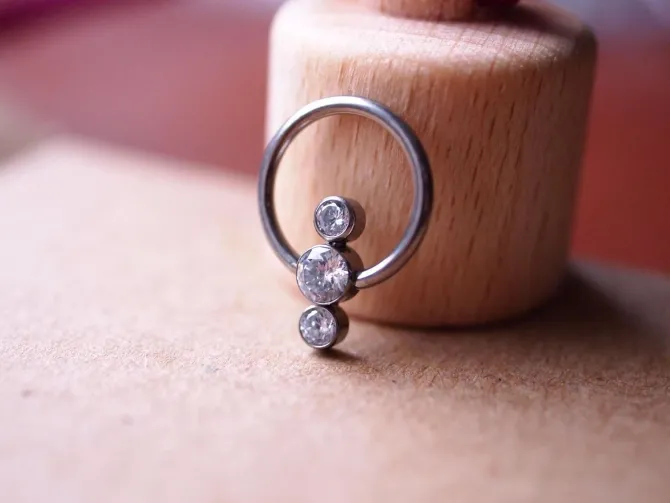 Niezwykły kolczyk w formie kółka z tytanu chirurgicznego wyróżnia się trzema urokliwymi kryształkami, które nadają mu blasku i elegancji. Ozdoba przyciąga uwagę i nadaje biżuterii subtelności. Jej wysokość i szerokość wynoszą odpowiednio 10 mm i 4 mm. Kolczyk jest nie tylko piękny, ale też trwały i bezpieczny dla ciała. Tytan chirurgiczny to materiał wysokiej jakości, który jest hipoalergiczny i zapewnia komfortowe noszenie bez podrażnień czy reakcji alergicznych. Łatwo się go czyści i nie traci na uroku pomimo upływu czasu.