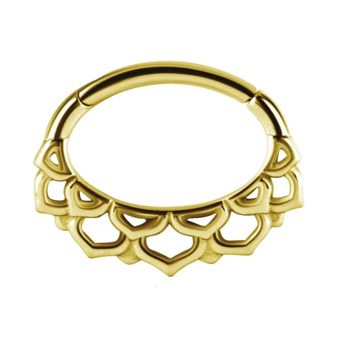 Złoty kolczyk w kształcie kółka możesz nosić w wielu miejscach – między innymi w uszach, i nosie. Dzięki zapięciu typu clicker z łatwością zdejmiesz i założysz biżuterię. Dzięki antykorozyjnym właściwościom stali chirurgicznej 316L nie musisz zdejmować kolczyka do kąpieli. W dolnej części piercing ozdobiony jest ażurową mandalą, która dodaje mu uroku. W przypadku tego modelu ciekawy wygląd łączy się z wysoką funkcjonalnością.