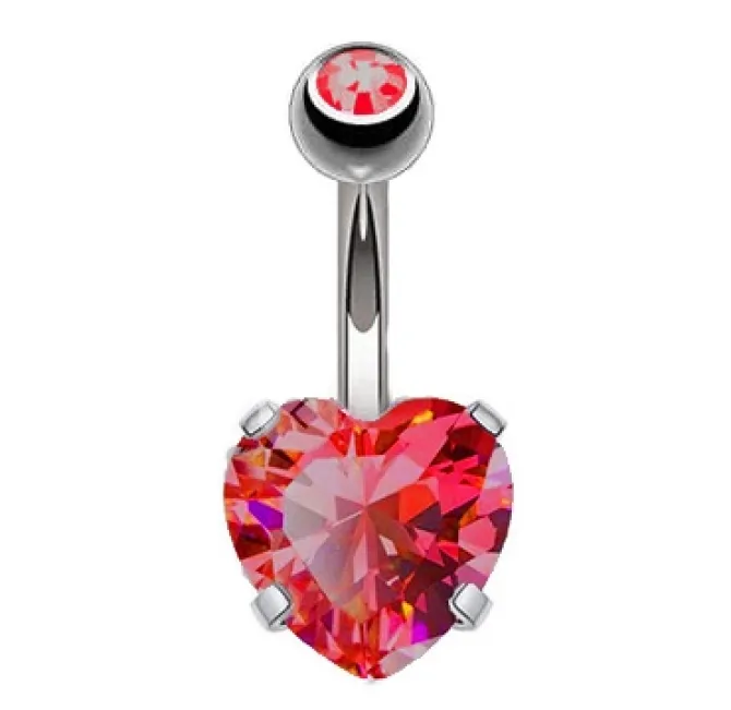 Kolczyk do pępka w kształcie serca zdobiony czerwoną cyrkonią
