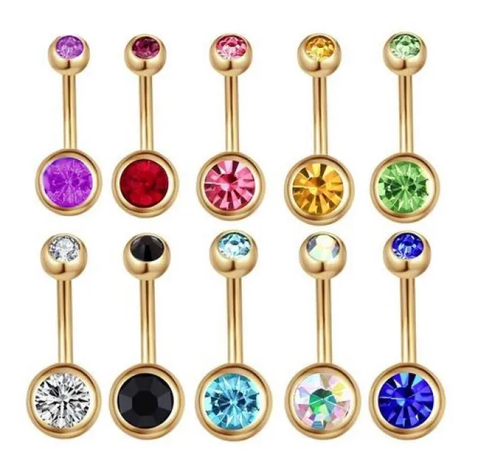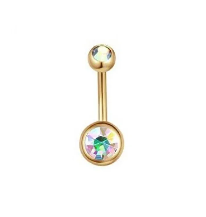 Kolczyk złoty przeznaczony do noszenia w pępku, którego ozdobą są dwie opalizujące cyrkonie. Większa znajduje się na dolnej kulce o średnicy 8 mm, a mniejsza, o średnicy 5 mm, w górnej części kolczyka. Kulka zakręcana jest na zewnętrzny gwint, który gwarantuje stabilne zamknięcie i zapobiega zgubieniu biżuterii.