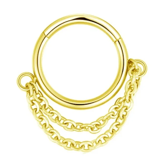 Kolczyk ze stali chirurgicznej z ozdobnym łańcuszkiem w kolorze żółtego złota. Zapięcie typu clicker zapewnia łatwe zakładanie i ściąganie kolczyka. Jednocześnie takie rozwiązanie sprawia, że złoty kolczyk pewnie trzyma się np. na uchu nawet przy mocniejszym szarpnięciu. Dzięki temu z powodzeniem możesz go nosić bez obaw, że kolczyk odepnie się przez przypadek i go zgubisz.