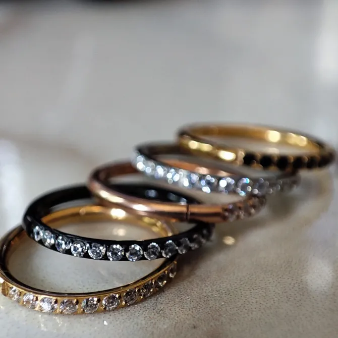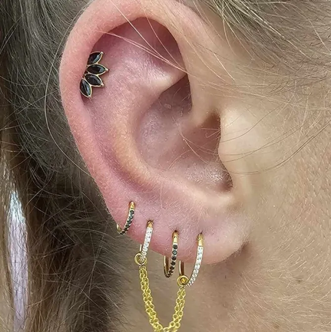 Kolczyk idealnie prezentuje się w piercingu typu rook, tragus, helix, conch, wardze, nosie (nostril) itd.