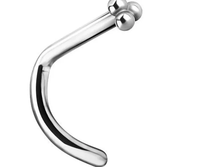 Tytanowy kolczyk do nosa z ozdobnymi kuleczkami to propozycja dla miłośników oryginalnego stylu. Jego nieco zakręcona forma i delikatne detale w postaci trzech kuleczek podkreślają rysy twarzy, a idealnie dopasowany kształt zapewnia wygodę noszenia w płatku nosa przez cały dzień.