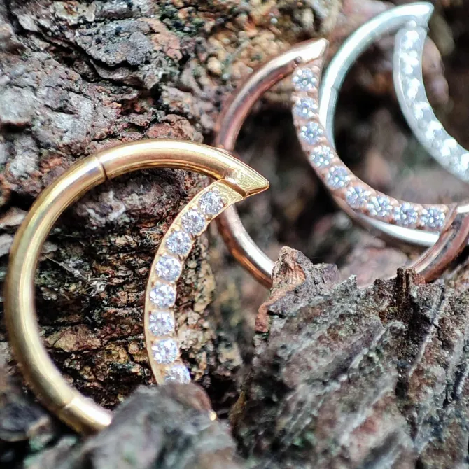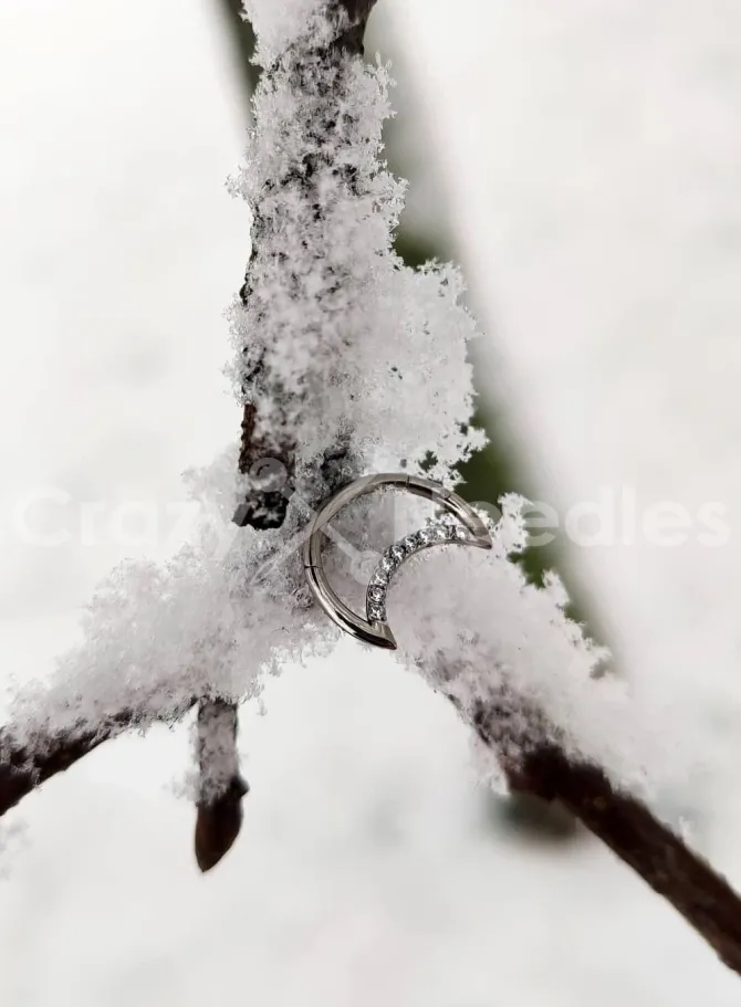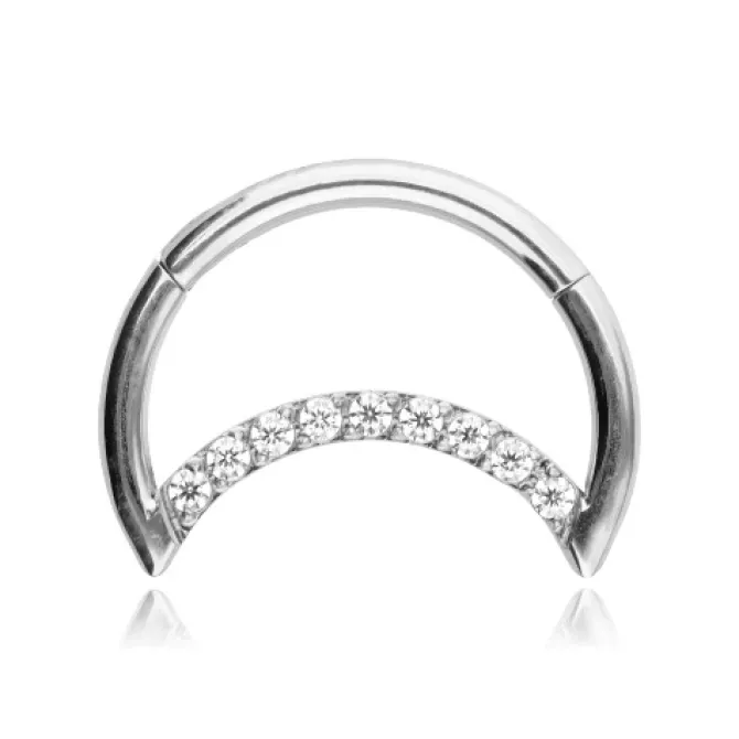 Prezentowany srebrny kolczyk, który możesz nosić na przykład w uchu lub w nosie, ma kształt przypominający księżyc. Jedna część ozdobiona jest dziewięcioma niewielkimi cyrkoniami o wyjątkowym blasku. Dzięki tej dekoracji biżuteria zyskuje przepiękny blask i przyciąga spojrzenia. Kolczyk clicker ma specjalny mechanizm, umożliwiającym łatwe i szybkie zakładanie i zapinanie, co ułatwia codzienne użytkowanie.